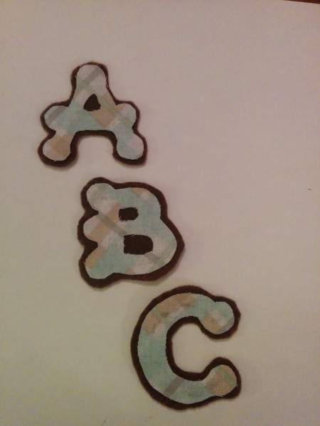 I decided to add some ABC's to the art. I love seeing different forms of art in one piece. I used some fabric that I found in the baby section. It is pretty gender neutral. This fabric will later be used for a cradle sheet that I will be sewing. I traced some wooden letters which I had on hand. They were the perfect size for this particular piece.