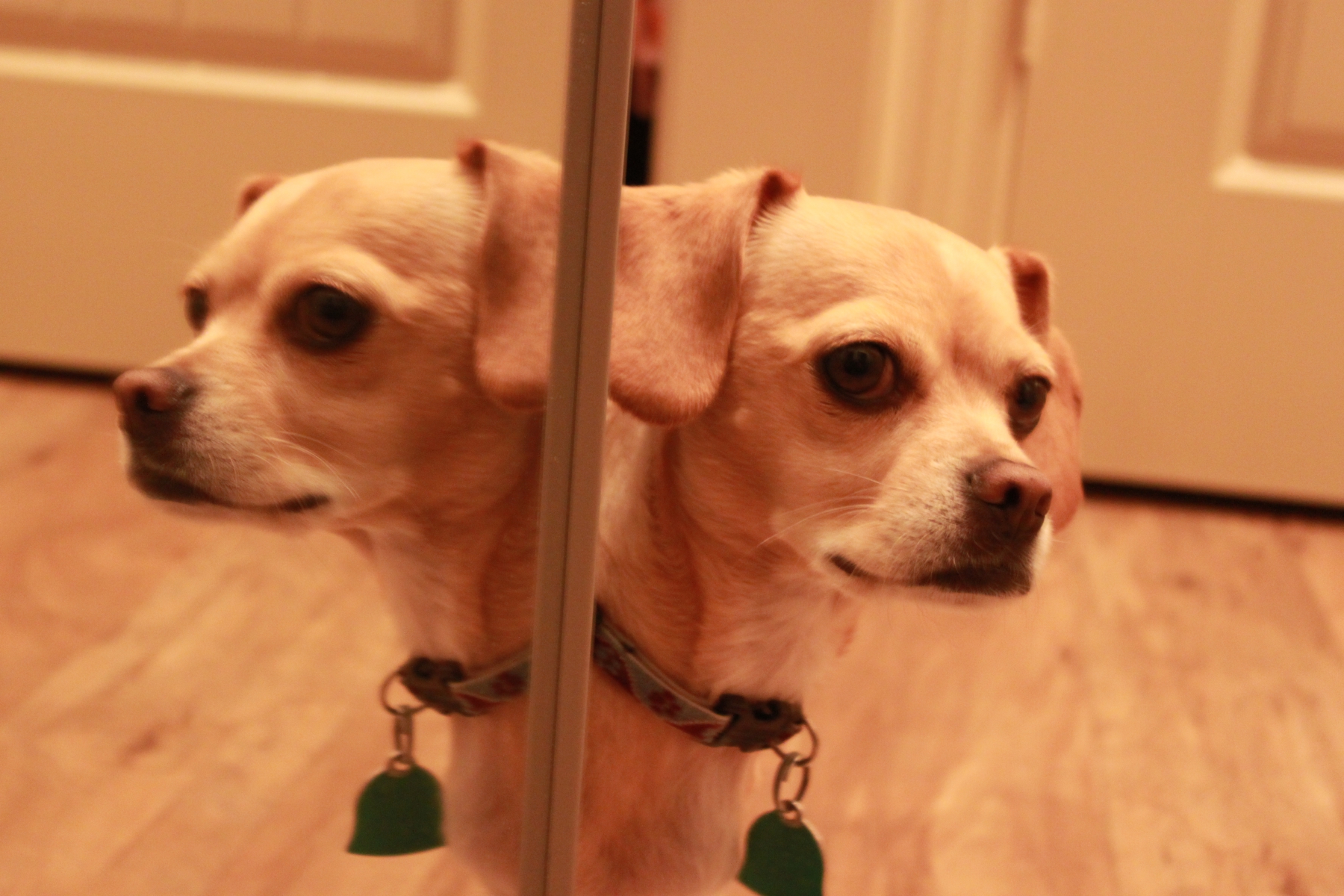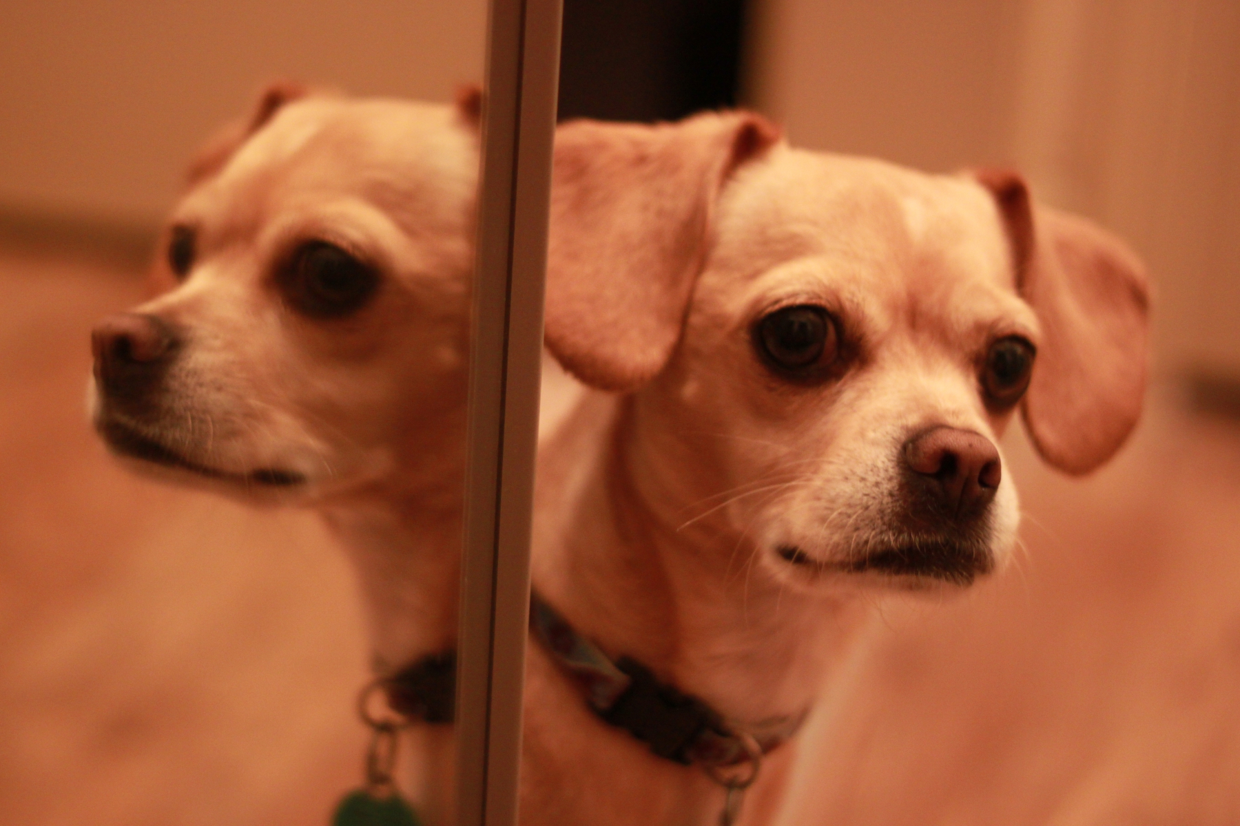 I took this picture the other night, Kona was peeking out of the closet and as I started walking towards him I saw his face in the mirror, it scared the crap out of me for a second, then I thought “Wait, this is a Kodak moment” I told him to stay while I got the camera and took a bunch of shots. He was so good and yes he was rewarded a treat after his photo shoot. Here are my two favorite shots…